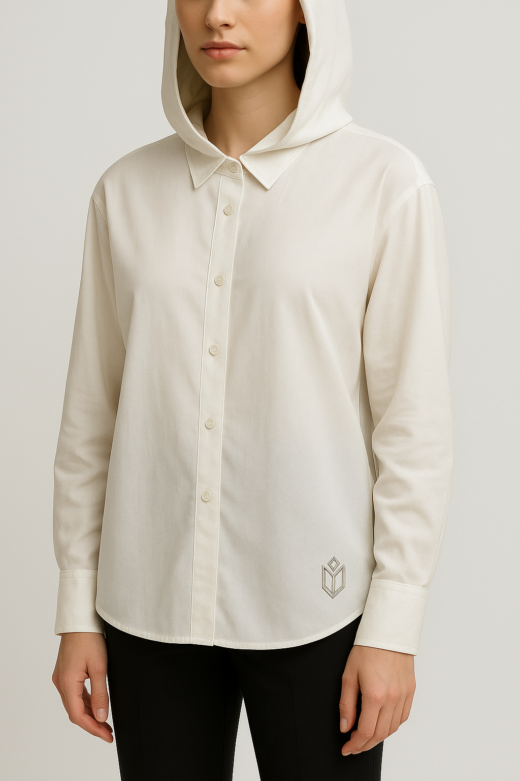 شومیز زنانه کلاسیک به رنگ سفید/کرم با طراحی خاص و کلاه یکپارچه. لوگوی میلونا بهصورت گلدوزی طوسی/نقرهای روی سرآستین کار شده است. استایلی مینیمال و آوانگارد که بین لباس رسمی و مد خیابانی تعادل ایجاد میکند.